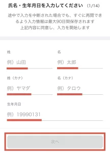 まずは、姓名・姓名(カナ)・生年月日を入力。