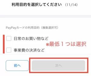 次にPayPayカードの利用目的を「日常のお買い物など」または「事業費の決済など」から1つ以上選択。