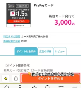 PayPayカード案件ページに記載されているポイント獲得条件や端末の設定を確認します。