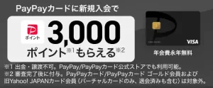 | キャンペーン名 | PayPayカード新規入会で3,000円相当のPayPayポイントプレゼント |