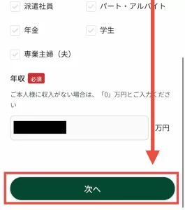 お勤め先(学校)について、主なご職業・会社の種類・勤務先(学校)の名前・住所・電話番号を入力。最後に年収を入力したら、「次へ」をタップします。