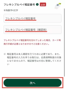 キャッシュカード・フレキシブルペイで利用する4桁の暗証番号をそれぞれ確認用含め、2回入力し、「次へ」をタップします。