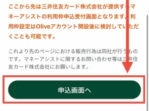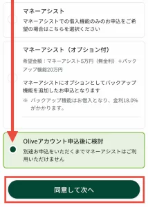 画面を下にスクロールしていき、マネーアシストを申し込まない場合は、「Oliveアカウント申込後に検討」をタップして選択してください。